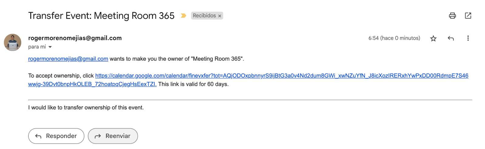 The email includes the previously written message and a direct link to the event. After the new owner accepts ownership, they will be set as the new event organizers in Google Calendar.