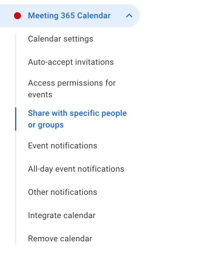 After opening the Calendar Settings, click the option that says “Share with Specific People or Groups.”