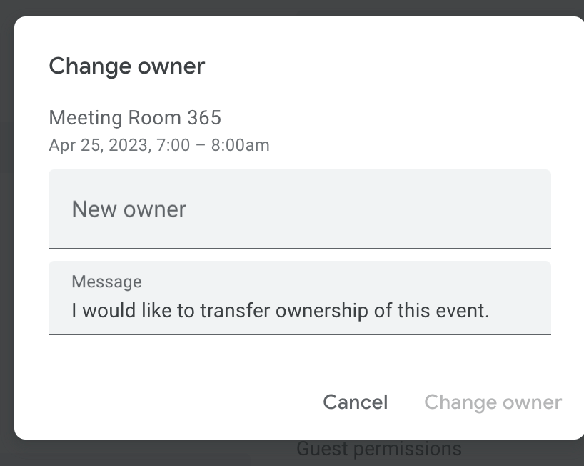 After changing the organizer of a Google Calendar event, the new event owner will be able to review Google Calendar time proposals, set a new time for the event, forward the Google Calendar invite to more people, and more.